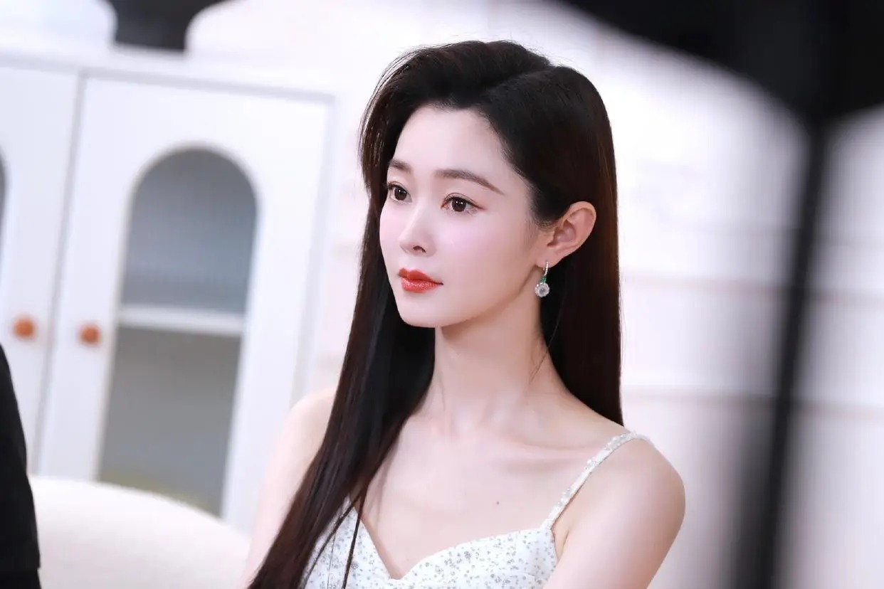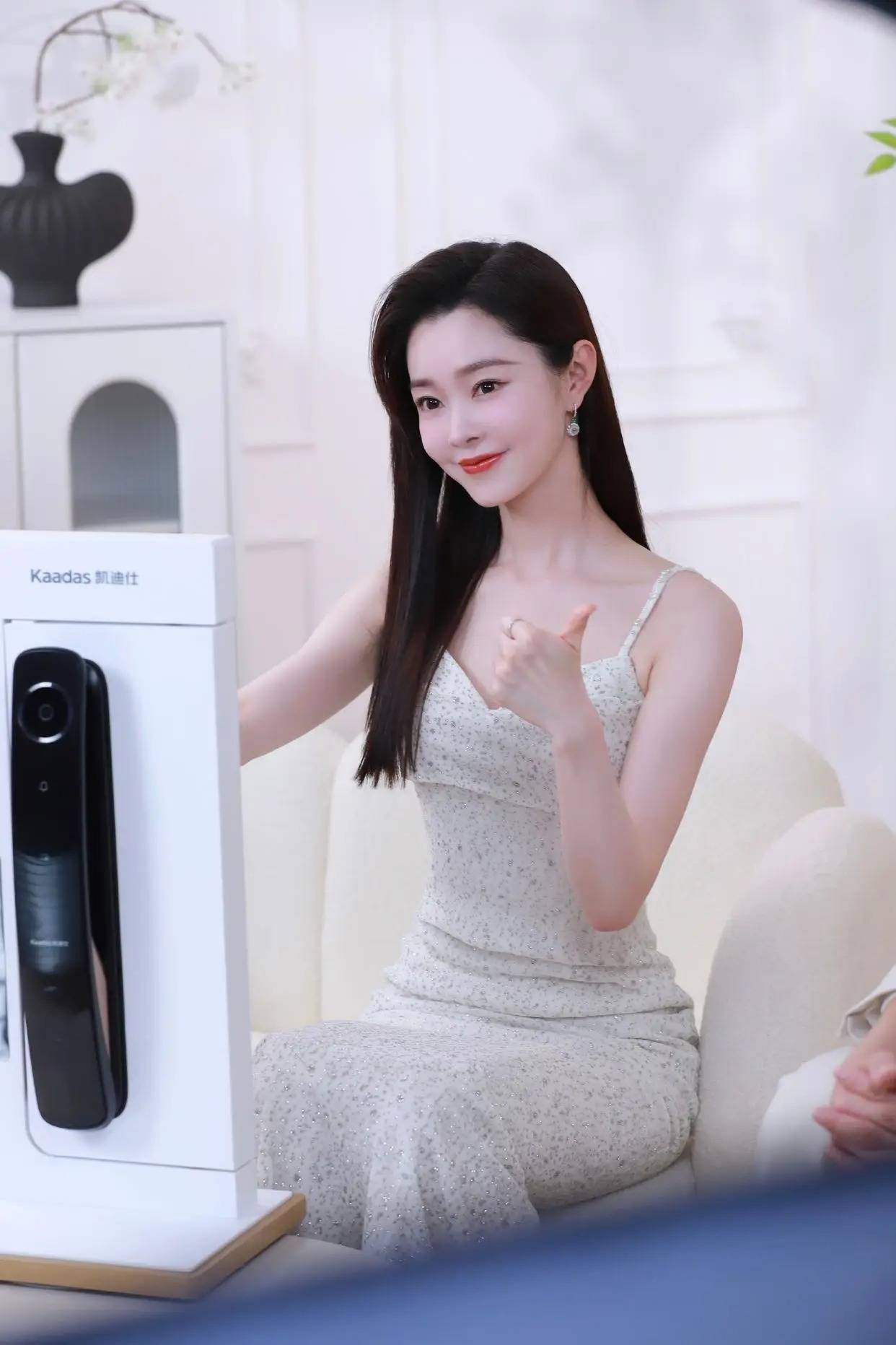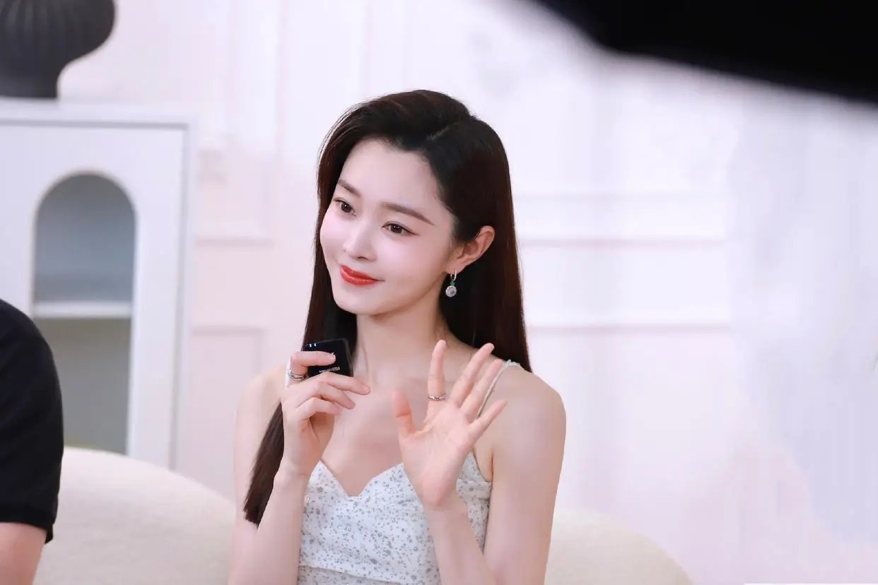 仔细看这套穿搭的细节,你会发现很多高明之处。裙身的细闪和碎花增添了精致度,避免了纯白的单调。她选择用珍珠项链叠戴来填补V领处的空间,既丰富了层次,又不会过于抢戏。无论是坐着接受采访,还是站着微笑互动,她都保持着挺拔优雅的仪态,这就是气质加持的结果。背景中简约的家居环境,也更衬托出她人淡如菊的气质。